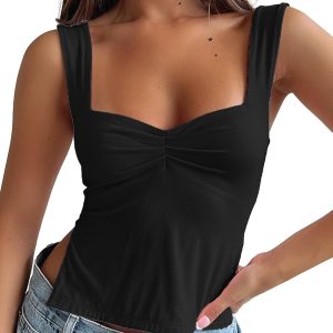 Women’s Sleeveless Backless Going Out Crop Tank Top Sexy Pleated Sweetheart Neck Strappy Y2K Slits Cropped Tops