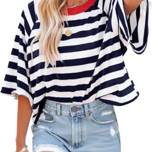 Dokotoo Tops for Women Striped 2024 Fashion T Shirts for Women Color Blocking Design Loose Basic Tee