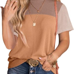 Dokotoo Womens Color Block Fashion Short Sleeve Crewneck Knitted Spring Summer Casual Loose T Shirts Tops