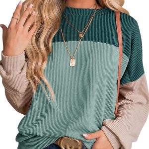 Dokotoo Womens Fashion 2024 Color Block Long Sleeve Crewneck Knitted Casual Loose Pullover Shirts Tops