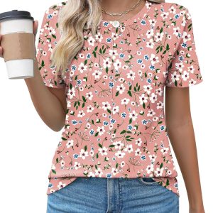 Kistore Womens Casual Crew Neck Short Sleeve Pleated Tops Blouses Fashion Clothes 2024