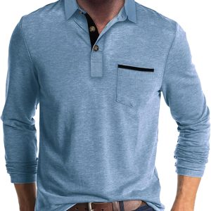 Mens Fashion Polo Shirts Cotton Classic Long Sleeve Thermal Button Shirt with Pocket