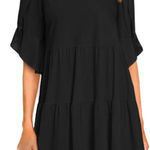 Lrady Women’s Casual Summer Tunic Dress V Neck Ruffle Loose Flowy Swing Mini Shift Dresses, Dark Black, X-Large